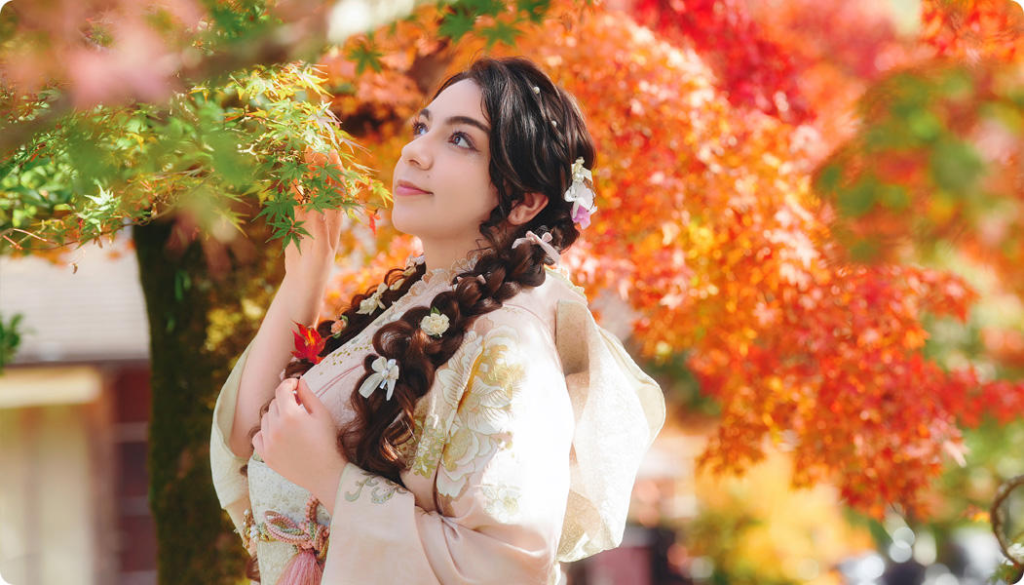 As the autumn wind sweeps through the ancient temple corridors, you’ll encounter your most beautiful self in a kimono amidst the rain of red leaves.